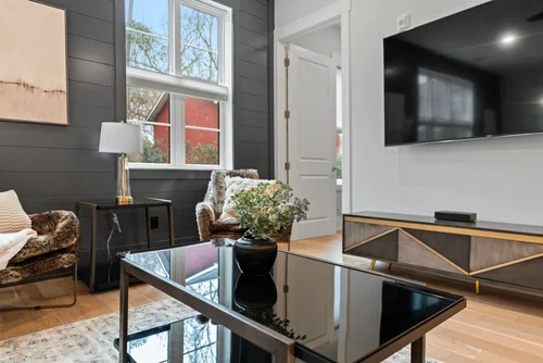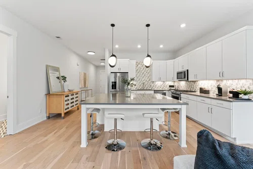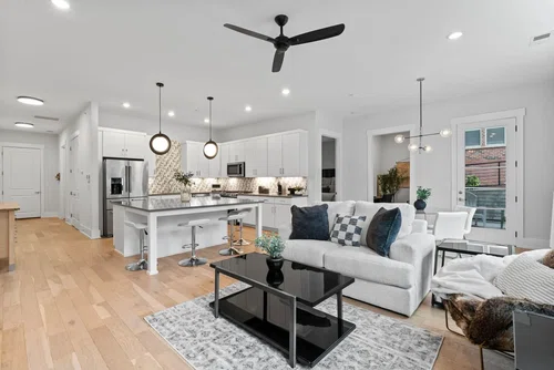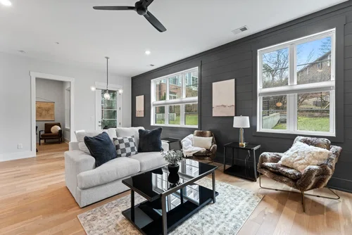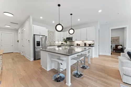 Step into this sophisticated two-bedroom, two-bathroom condominium, perfectly situated in the vibrant heart of Nashville. Built in 2021, this meticulously designed home blends modern elegance with urban convenience. The open-concept layout features a gourmet kitchen equipped with premium KitchenAid appliances and a massive island, flowing seamlessly into the dining and living areas—ideal for entertaining or relaxing. Large windows flood the space with natural light and offer a serene view of the landscaped backyard—yours to enjoy without the upkeep.