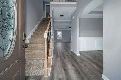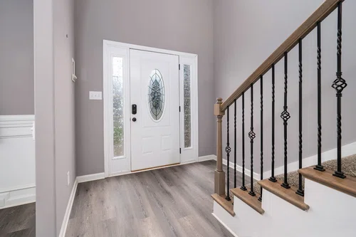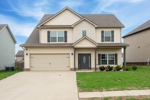 This spacious home boasts all bedrooms located upstairs, complemented by a wide open floor plan on the main level. Upon entering, you'll be welcomed by a versatile flex space ideal for a formal dining area or an office. The living room, enhanced by a cozy gas fireplace, is filled with natural light thanks to its large windows. The open layout seamlessly connects the eat-in kitchen to the main living area, featuring elegant granite countertops, luxury vinyl plank, and tile flooring. Upstairs, you'll discover four generously sized bedrooms. The primary suite offers a stunning fully tiled shower and a dream walk-in closet. Enjoy the serene backyard from the covered back porch. While the yard is not fenced, the presence of neighboring fences ensures a sense of privacy.