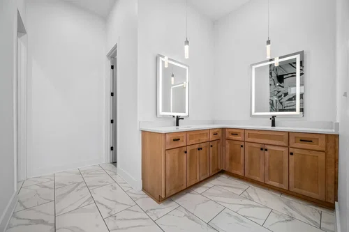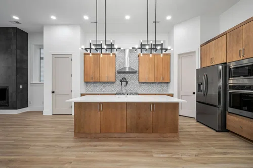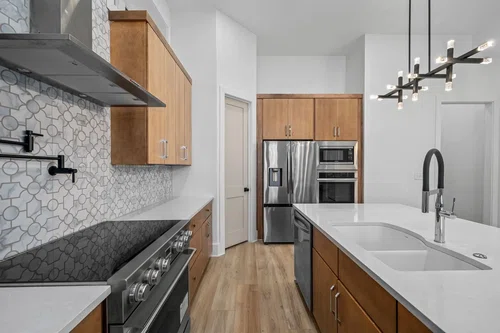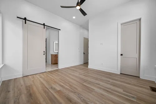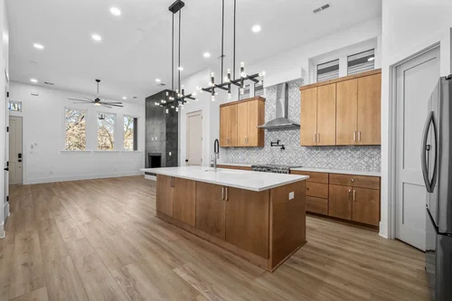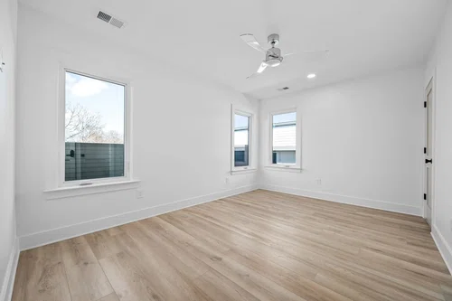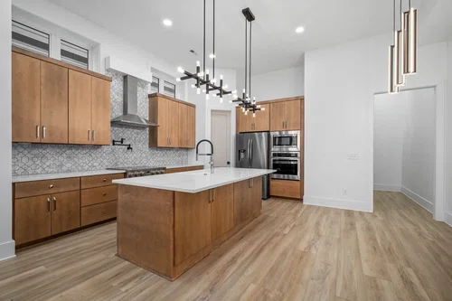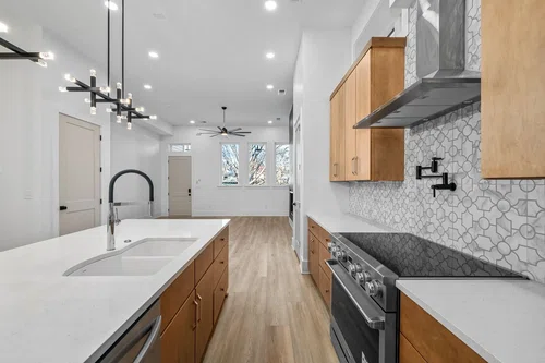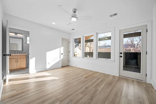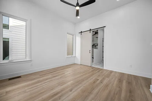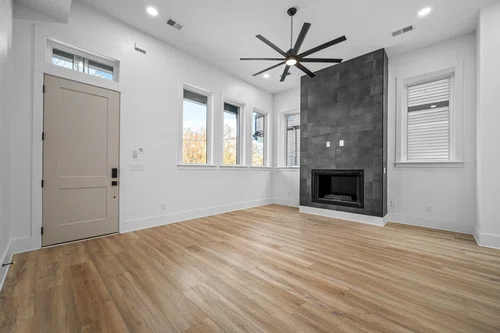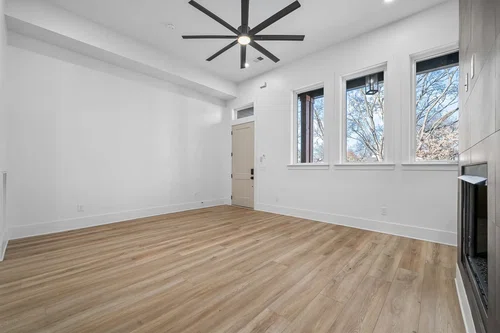 Experience luxury living in this exquisite 4-bedroom, 4.5-bath attached townhome. Each bedroom boasts a private en suite, with the primary suite featuring 11-foot ceilings, dual custom closets, multi-faucet shower heads, backlit mirrors, and a sliding barn door. The open floor plan with 12-foot ceilings includes a chef’s kitchen with custom cabinetry, dual ovens, a large island, pot filler, and a walk-in pantry. Relax on the large covered front porch, two decks—one with a fireplace and fan—and enjoy smart locks throughout. luxury vinyl plank, Hardwood stair treads, tile flooring throughout. home. Rear alley 2-car garage prepped for EV charging.