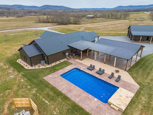 Welcome to your dream home! Nestled on an expansive 81.15 acres of serene land, this stunning property combines luxury, comfort, and practicality in the most spectacular way. Upon entering, you’ll be greeted by soaring tall ceilings that create a bright, open atmosphere throughout the home. The chef’s kitchen is a masterpiece, featuring top-of-the-line KitchenAid appliances, ample counter space, and an inviting layout that is perfect for entertaining or everyday meals. Step outside to your own private oasis—a gorgeous pool with sweeping views of the surrounding nature, offering the perfect spot to unwind after a long day. For those who appreciate quality outdoor living, this property includes a magnificent horse barn, ideal for equestrian enthusiasts, as well as direct access to a beautiful creek that runs through the property. A large detached garage provides additional storage and workspace, giving you plenty of room for all your tools, toys, or hobby projects. Whether you’re looking for a place to enjoy peaceful country living, entertain guests, or pursue outdoor adventures, this 3,488sqft home (6,638sqft under roof) offers it all in a truly breathtaking setting. Come experience the perfect blend of modern amenities, luxurious features, and wide-open spaces. This exceptional and newly-built estate is waiting for you to call it home!
