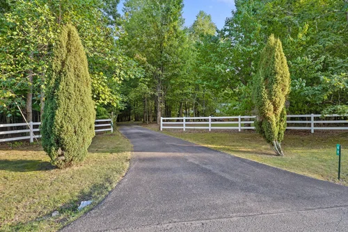 Set back 400 feet from the road, the home's winding driveway offers complete seclusion. The front area is fenced, providing a secure space for pets and keeping out unwanted wildlife.