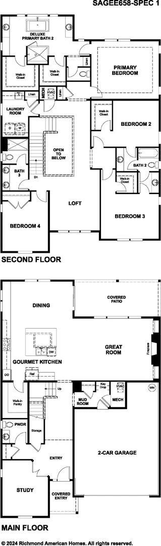 At the heart of the two-story Sage plan, you’ll find an expansive great room, complete with a cozy fireplace and built-in bookcases. The main floor also features a charming dining area and a gourmet kitchen with a large island and walk-in pantry, as well as a convenient powder room and an elegant study with French doors off the entry. Upstairs, discover an airy loft and four beautiful bedrooms, including a lavish primary suite boasting two walk-in closets and a deluxe bath with dual vanities. You’ll also appreciate a central laundry, two additional bathrooms and a dramatic tray ceiling in the primary suite.