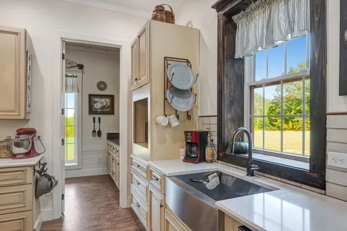 This brick farm house embodies the perfect blend of rustic charm and modern sophistication. The sturdy styrofoam block concrete insulated walls, enforced with rebar, stand as a testament to both durability and sustainability, providing not only protection from the elements but also maintaining an ambient temperature throughout the year. The open living area, bathed in natural light streaming through large windows, offers views of the farmstead beyond. Rich hardwood floors and shiplap walls add a touch of rustic allure. The well thought out kitchen offers a custom built island for entertaining. Adjacent to the main living quarters lies the mother-in-law suite, a haven of privacy and convenience. Designed with its own separate entrance, bedroom, living area, and kitchenette, it providing space for guests or extended family to retreat and unwind in style. Bonus room upstairs with full bath. Stretching across the front, the porch offers a panoramic view of the sprawling farmstead.